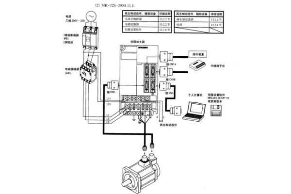 伺服电机线束接线主电路分为直流和交流伺服电动机两大类,包括R、S、T三相线和U、V、W与电机的接线,PLC连接驱动器的CN1,编码器与CN2连接。伺服电机线束接线图如下图所示: